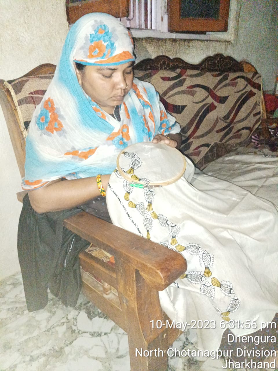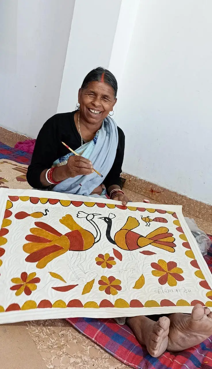 Lakshmi Devi, a resident of Jorakath village, had always been drawn to art due to her mother-in-law doing it on wall as cultural practices during harvesting festival and marriage ceremony but lacked the resources to pursue her passion to get fine quality to bring it on sellable products. When the Sohrai Kohvar art training by SIDBI’S project care was introduced to her village, she eagerly joined the group. Under the guidance of skilled mentors, Lakshmi honed her artistic skills and developed a unique style that blended traditional motifs with contemporary elements. With newfound confidence, she started showcasing her artwork at local exhibitions and online platforms. Her dedication and talent caught the attention of art enthusiasts, and she soon received orders for custom pieces from across the country. Today, Lakshmi Devi’s name is synonymous with exquisite Sohrai Kohvar art, and her success story stands as an inspiration for aspiring artisans in her village for youngsters.